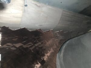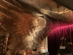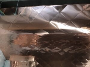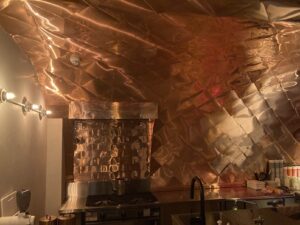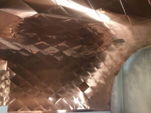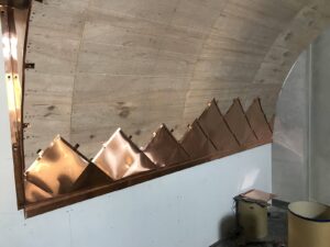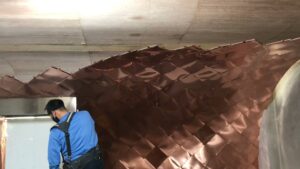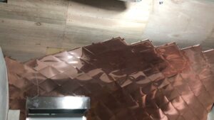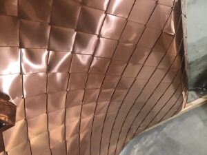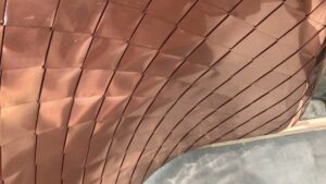 施工事例【デザイン・近代建築】 2023.10.182024.04.04 ひしがたぶきの内装です。非常に芸術的な仕上がりになります。 複雑な形状をひしがたぶきで施工するには技術が求められます。3DCADデータも使用し慎重に形状を決めていきます。 銅板金ならではの滑らかな形状を実現できます。時間をかけて緑青色に変わっていきます。 経年での変化を楽しむことができる芸術的な空間に仕上がります。
